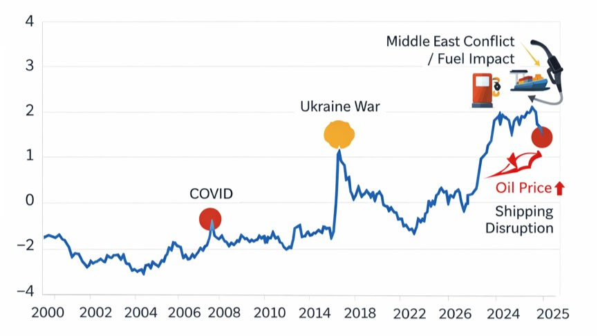 At the global level, the NY Fed's Global Supply Chain Pressure Index — the benchmark used by central banks and logistics operators worldwide - was already trending upward alarmingly. The Hormuz closure hadn't yet registered in that reading.