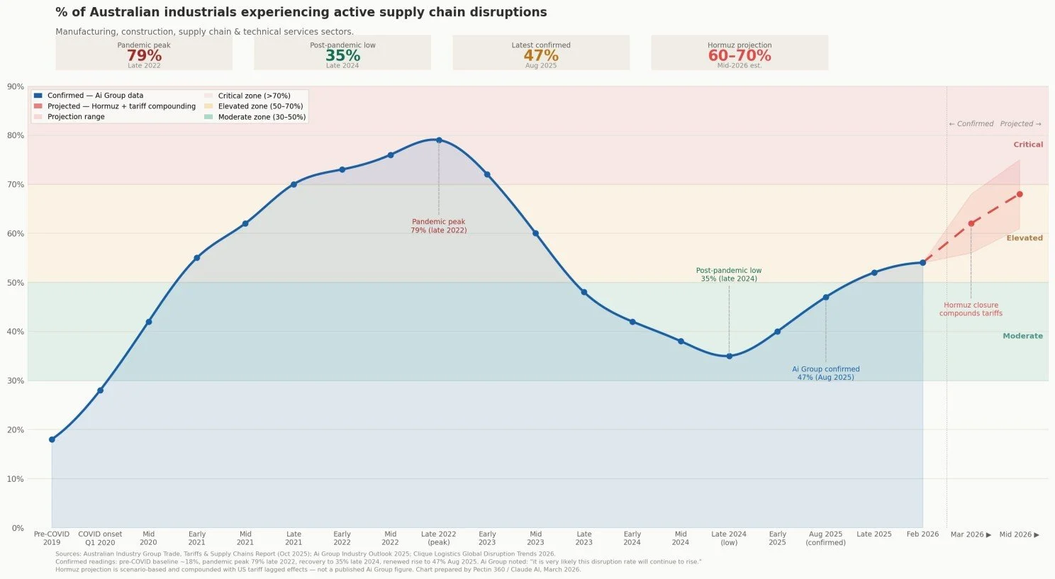 The Australian Industry Group's most recent data shows 47% of Australian industrials are now experiencing active supply chain disruptions, up from 35% in late 2024. That recovery from the pandemic-era peak of 79% took nearly three years. The Hormuz crisis, compounded by US tariff effects still working through global supply chains, threatens to reverse much of that progress within months. The AI Group was explicit - surveyed just four months after the initial US tariff announcements, they noted the disruption rate "is very likely to continue to rise."